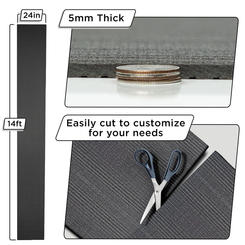 - Easy to Customize: Measuring 30ft long x 24" wide x 5mm thick, this easy-to-cut, non slip mat roll can be cut perfectly to fit any space, ensuring maximum efficiency and convenience; recommended for indoor use only