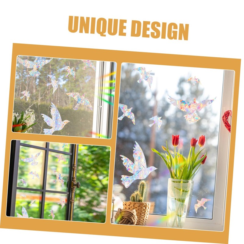 -Bird shaped design, with special design it will show a colorful visual effect when sunlight hits the cling after installation window sticker decor.