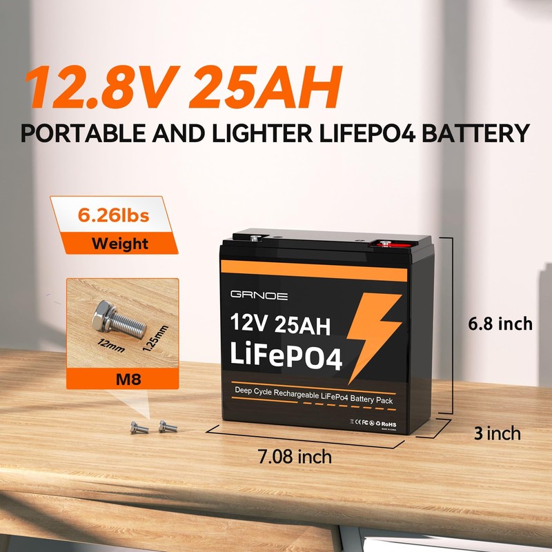 12V 25Ah LiFePO4 Battery, Up to 3000 Deep Cycles Rechargeable Lithium Battery with Built-in 20A BMS for Solar System, RVs, Power Wheels, Trolling Motors, Scooters, Camping, etc.