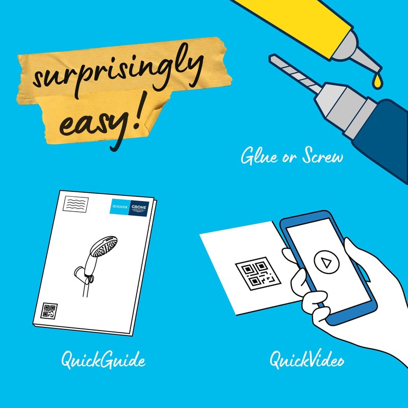 • The holder can either be screwed in with the supplied screws and dowels or simply glued; for this you only need the Grohe QuickGlue Set S1 (41246000, sold separately);