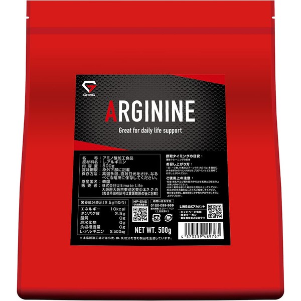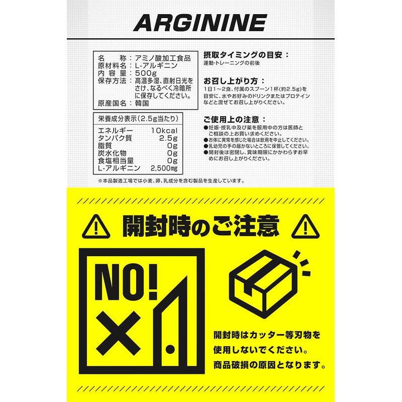 - 【原材料名】L-アルギニン【原産国名】韓国【内容量】500g 【摂取タイミングの目安】運動・トレーニングの前後 【栄養成分表(2.5g換算)】エネルギー/10kcal、タンパク質/2.5g、脂質/0g、炭水化物/0g、食塩相当量/0g L-アルギニン/2,500mg