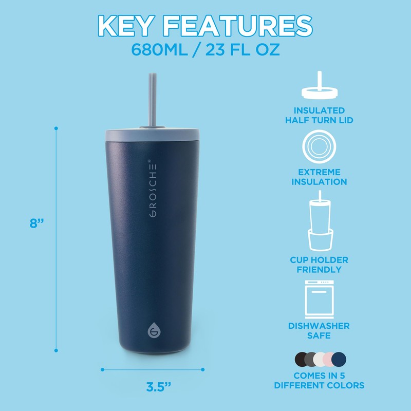 GROSCHE Jasper 23oz Tumbler with straw. Extreme Insulation, Classy Design, Built to Last, Insulated Stainless Steel Tumbler with Lid and Straw - Blue