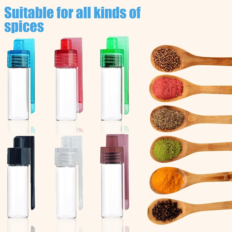 - Easy to use: The travel salt and pepper shakers mini is brown in color, and the cap has 6 colors, which makes it easy to distinguish different spices;The spoon design on the cap allows you to easily take out the seasoning from the bottle