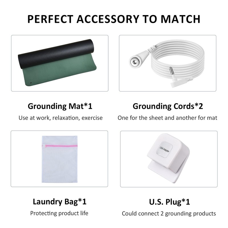 - Complete Accessories: The package includes ground fitted sheet *1, grounding well pad *1, laundry bag *1, grounded cable *2, american standard plug *1, user manual *2. The bedspread and grounding well mat can meet your various use scenarios, the earthing sheets can be machine washed, and the laundry bag can help you clean and protect the product, prolonging the life of the product and helping you get a health sleep.