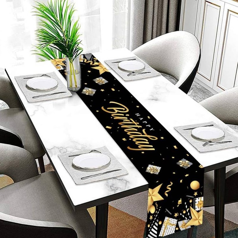 GROVBLE Birthday Table Runner, Happy Birthday Table Runner, Black Gold Birthday Decoration, Table Decoration Tablecloth Birthday for Boys Men Birthday Decoration 180 x 35 cm