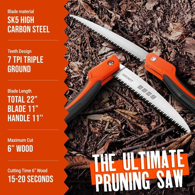 GROWIT Folding saw 11 Inch - Heavy Duty Pruning Saw with Triple-Cut SK5 Blade, 7 TPI Razor Teeth for Tree Trimming, Wood Cutting, Camping, Bushcraft, and Gardening