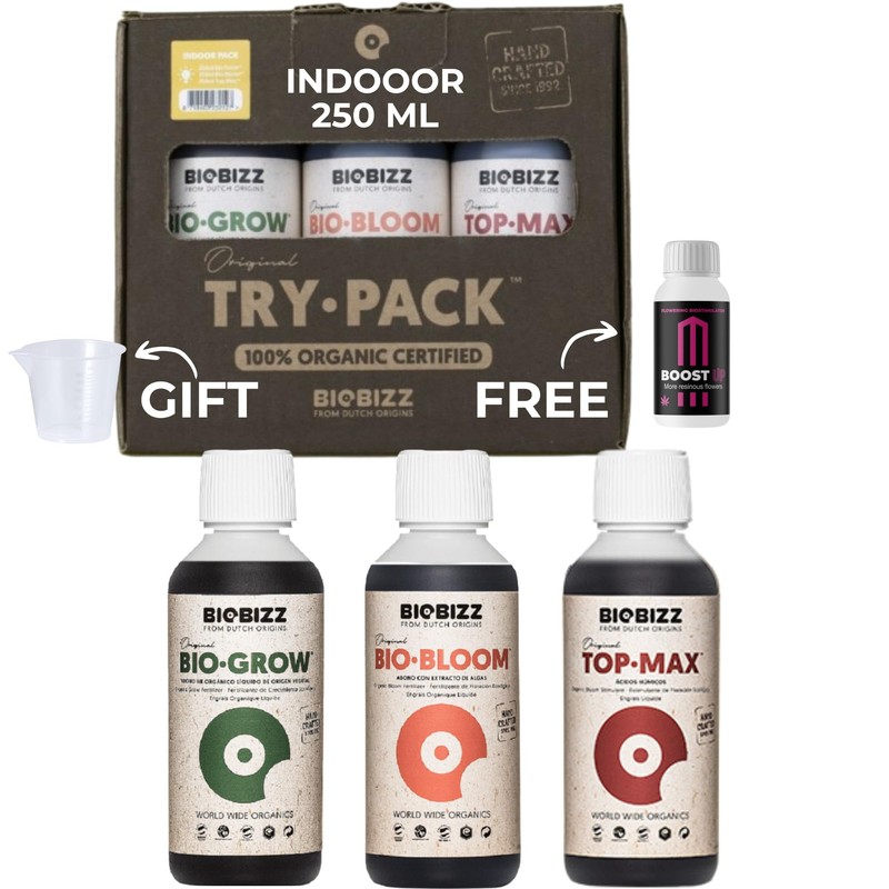GROWMANIA.ES Growmania Trypack Indoor Biobizz + Boost Up Nutrients Probe + Messbecher | Bio Grow, Bio Bloom und Top Max Dünger für Pflanzen und Kulturen | Wachstumsstimulation