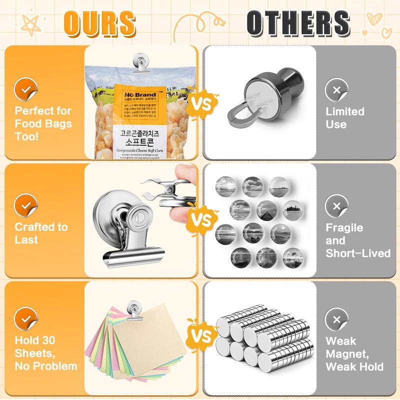 - 🌻Multi-Purpose: These magnetic clips are not only suitable for refrigerator notes and photos but also can be used as a food bag sealing clip to keep snack bags and frozen food bags fresh; it is also a good helper to fix documents, or hang keys. Suitable for various occasions such as kitchens, offices, garages, and schools, making life full of possibilities
