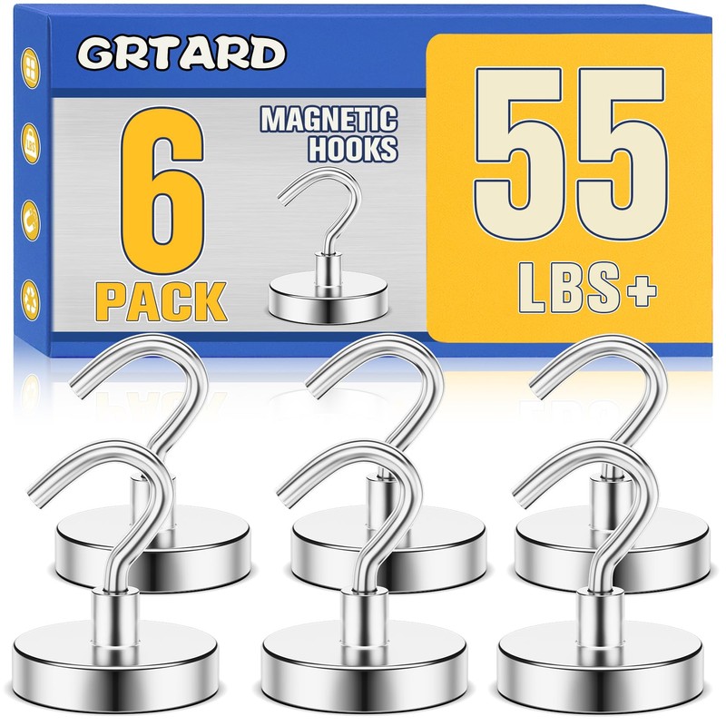 Grtard 55 LBS Magnetic Hooks Heavy Duty, 6 Pack Neodymium Magnet Hooks for Cruise Cabin, Strong Magnetic Hooks for Hanging, Magnets with Hooks for Home, Kitchen, Workplace, Bathroom(Silver)