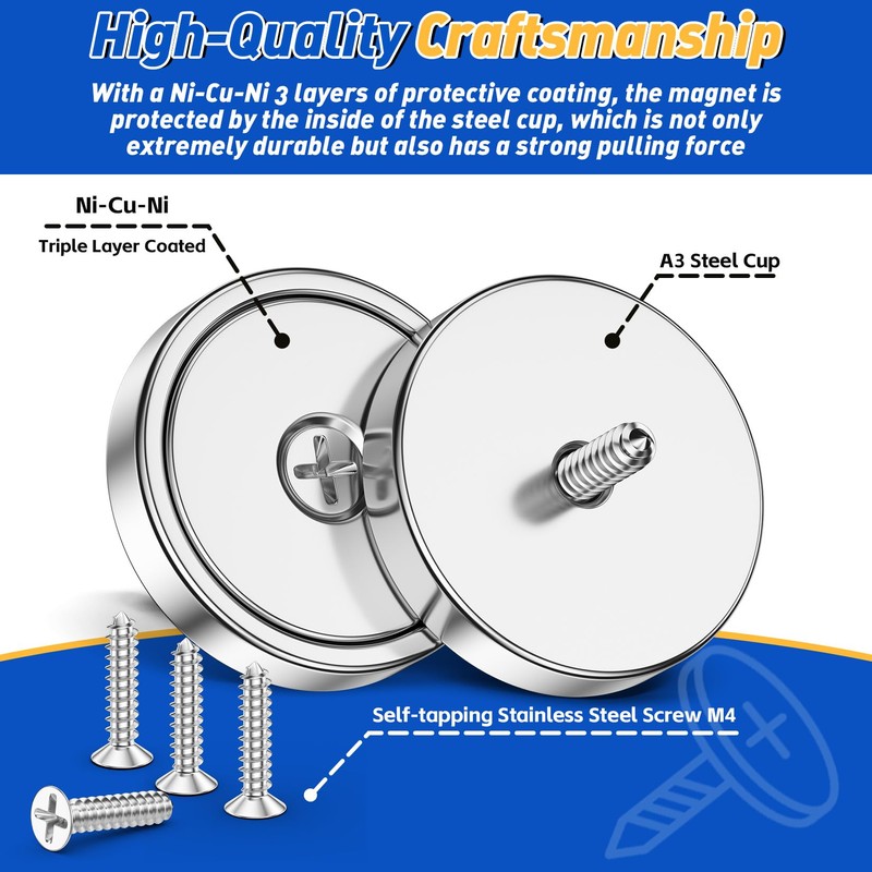 Grtard 8 Pack Neodymium Cup Magnets, 100LBS Holding Force Strong Rare Earth Magnets with Heavy Duty Countersunk Hole and Stainless Screws for Refrigerator, Tool Room, Science, Craft, Office and Garage