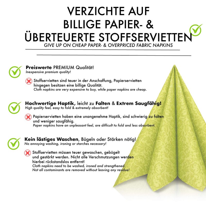 - Premium disposable napkins green – the upscale catering industry is absolutely convinced of our Airlaid napkins in daily business. 40 x 40 cm in size and a 1/4 fold offer the optimal size for a wide range of folds