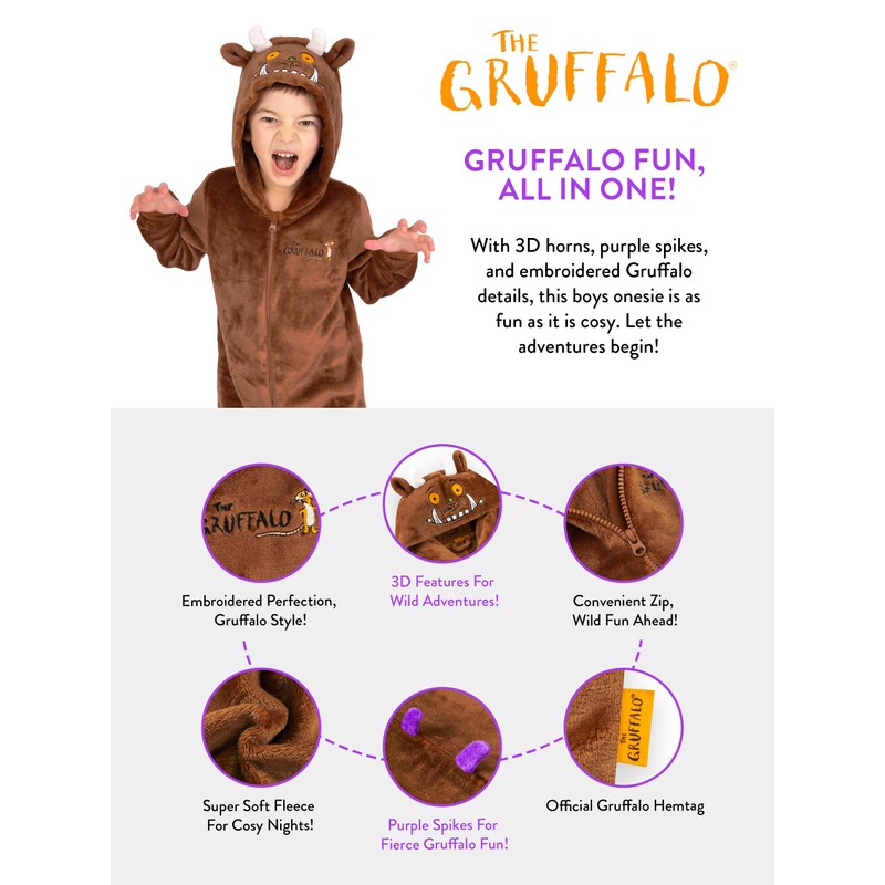 - The ultimate Gruffalo onesie sleep suit for children: make bedtime magical with this children's onesie inspired by the beloved Gruffalo! The long-sleeved fleece jumpsuit for children in brown is created for ultimate comfort and fun. Perfect for playing and sleeping, this cuddly jumpsuit for boys made of fleece is an essential onesie for "the Gruffalo" fans