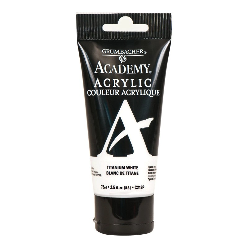 Titanium White is the most opaque white with the heaviest tinting strength. It is most appropriate for direct painting or for quickly lightening colors. Grumbacher Academy Acrylics is a line of 48 brilliant process colors, metallic and iridescent colors, as well as the most sought after traditional colors. All colors have an ASTM lightfast rating of 1- Excellent. Academy Acrylics are highly pigmented and have superior tinting strength, but at a student price. Available in 90ml metal tubes and 75ml & 200ml plastic tubes. Made in USA. Since 1905, Grumbacher has been a brand trusted by students, professors, art conservationists, and professional artists throughout the United States.