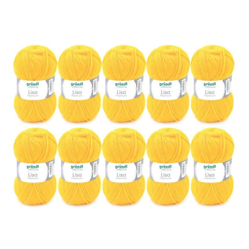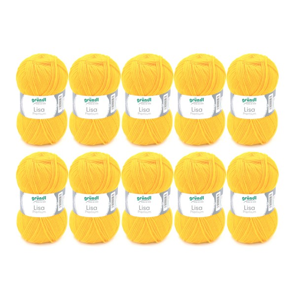 Gründl Lisa Premium Plain Knitting and Crochet Yarn (Soft and Wool-like Character, Easy-Care Washable Knitting Yarn Made of 100% Polyacrylic Fibre, 50 g/133 m, Needle Size: 3.5–4.5, 10 Balls), Yellow