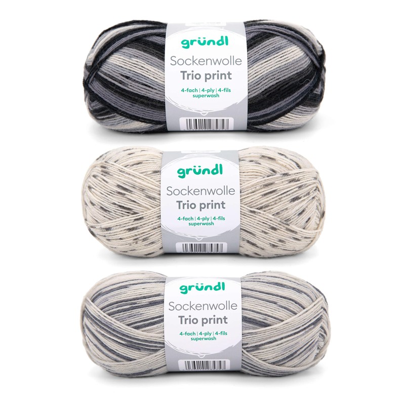 • Box contents and other features: Gründl sock wool trio / 4-ply sock yarn / 3 x 100 g / 75% virgin wool (superwash), 25% polyamide / tension sample: 30 m x 40 r = 10 x 10 cm / material consumption: socks = approx. 100 g to size 46