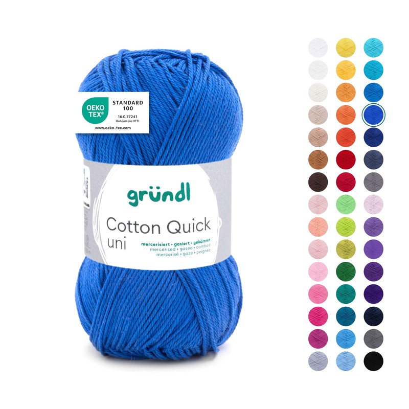 - Box contents and other features: Gründl cotton quick plain knitting yarn/crochet yarn, 1 x 50 g, 100% cotton, tension sample: 22 m x 30 R = 10 x 10 cm, material consumption: jumper (size 38) = approx. 450 g