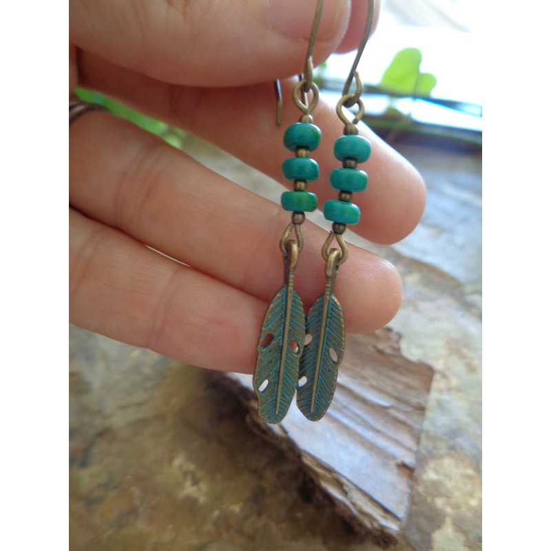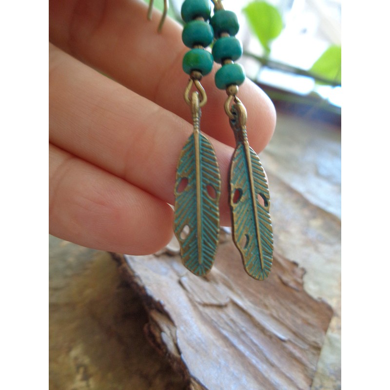 ⊹⊱✿ GRÜNE PATINA FEDER IN BRONZE & GRÜNE STEIN RONDELLE ✿⊰⊹ Ohrringe, handgef...