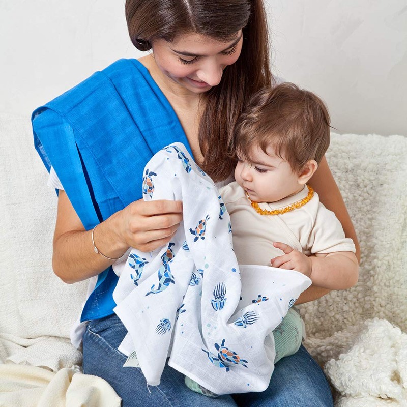 GRÜNSPECHT Organic Muslin Nappies 70 x 70 cm 100% Cotton (kbA) Burp Cloths, without Optical Brighteners, Skin-Friendly and Absorbent, Pack of 2, Blue and Sea Animals (690-V2)