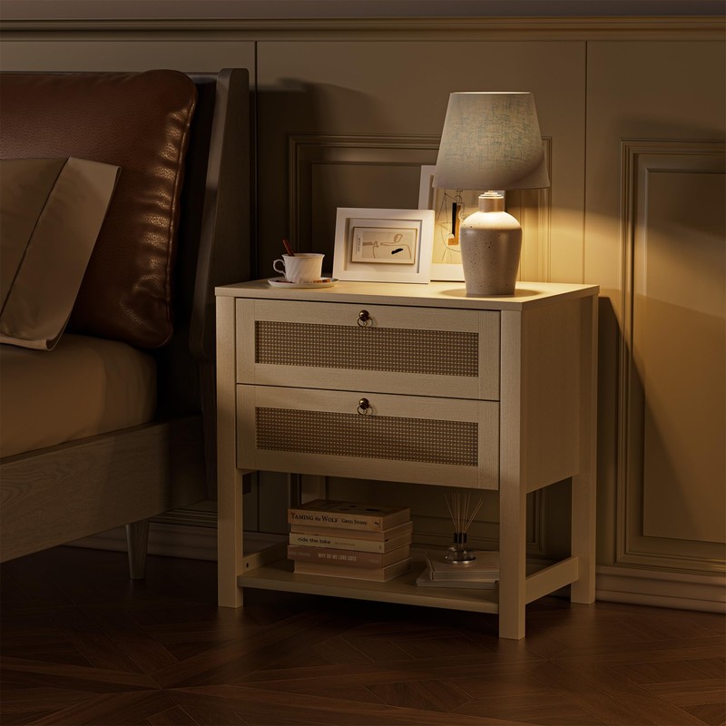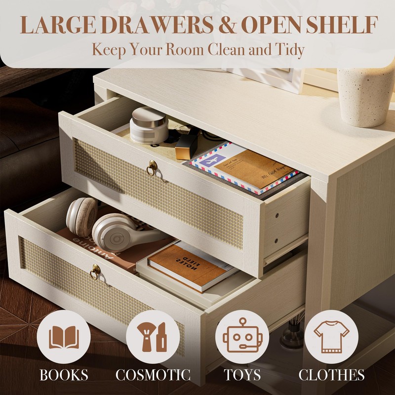 - [Multiple Night Stand] Measuring 15.75"D x 26.77"W x 25.71"H, this nightstand with two rattan decor drawers & one open shelf give you plenty of storage space. Say goodbye to clutter and hello to organization! From books and journals to bedside essentials, our rattan nightstand provides plenty of space to keep your belongings neatly tucked away yet easily accessible.
