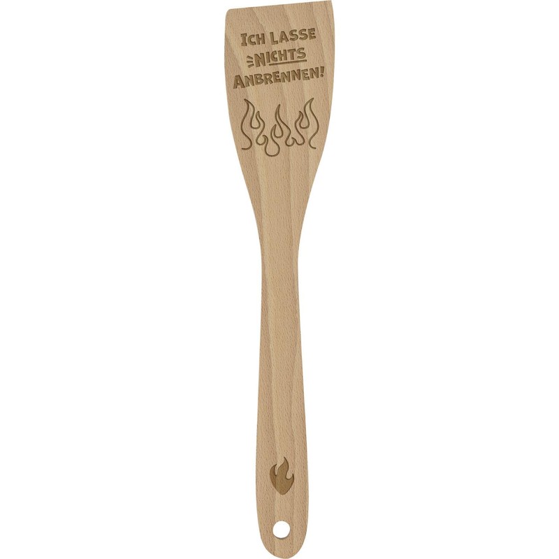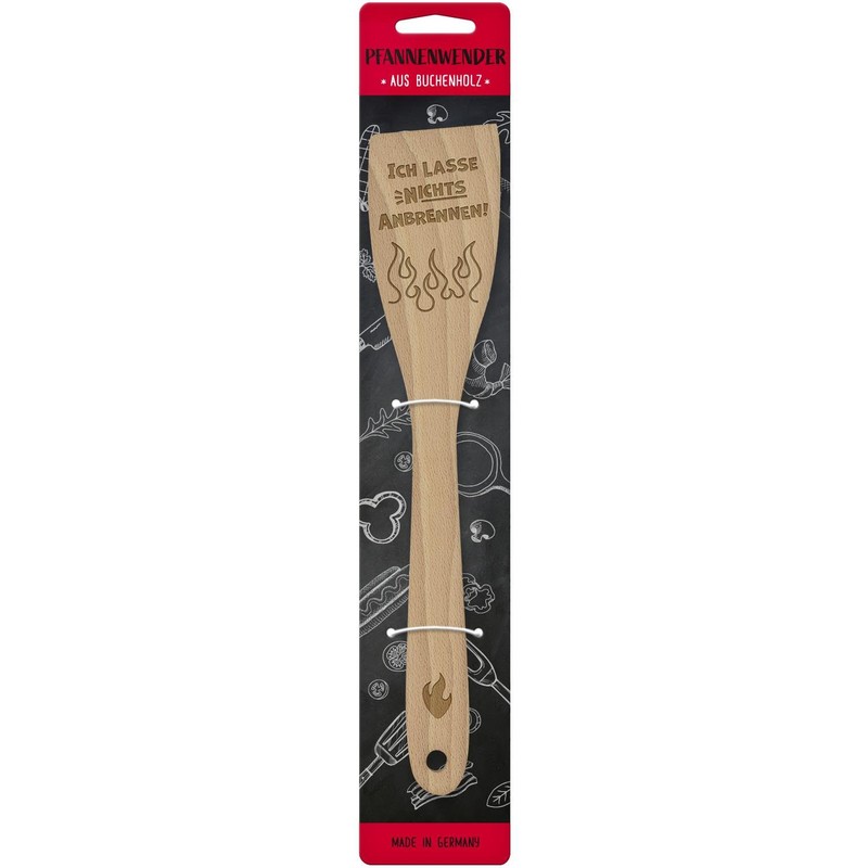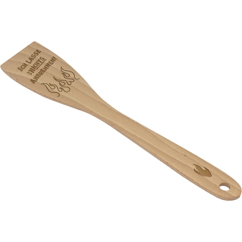 - Spatula with saying: The wooden spatula carries the burnt saying "Ich lassen nichts anbrennen". Beech wood roasting shovel, length 30 cm, attached to a designed header card for gifting.
