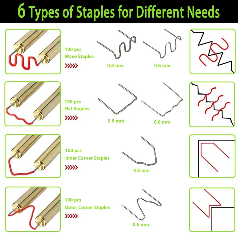 - - The plastic repair welder comes with 600pcs staple kit for different repair and welding needs. 100 x 0.6mm flat staples, 100 x 0.8mm flat staples, 100 x 0.6mm wave staples, 100 x 0.8mm wave staples, 100 x 0.6mm inside corner staples, 100 x 0.8mm outside corner staples.