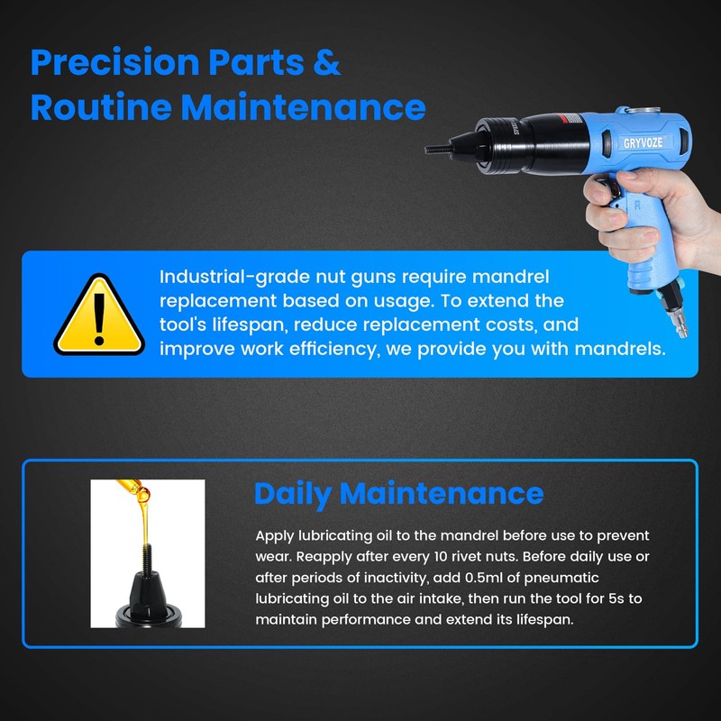 - Note: The pneumatic rivet nut gun head used together with the mandrel is suitable for carbon steel, copper, aluminum, and zinc-plated rivet nuts. It is not suitable for flat-head semi-hex or Multi-Grip rivet nuts, and not recommended for use with stainless steel rivet nuts