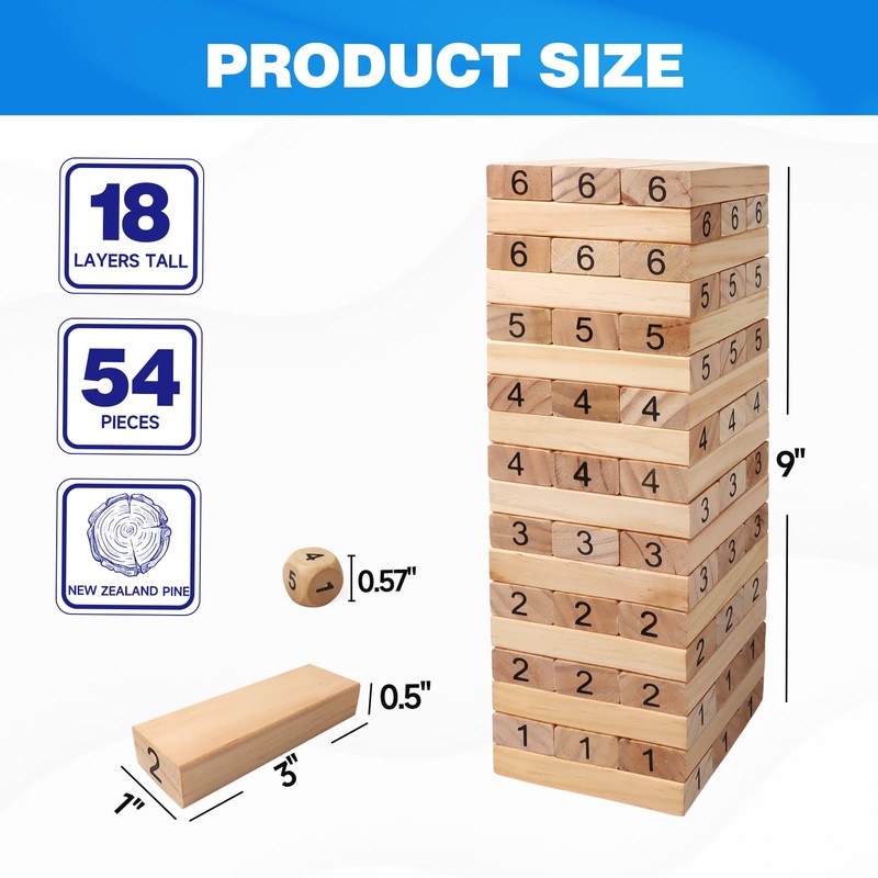 - INCLUDED & SIZE: The stacking board game set comes with 54 wooden blocks that are 3" x 1" x 0.5" timbers for a full 18-story, you can stack to nearly 1.5 feet high during play! The set includes two wooden number dice to set up a variety of play methods, and also comes with a playing guide.
