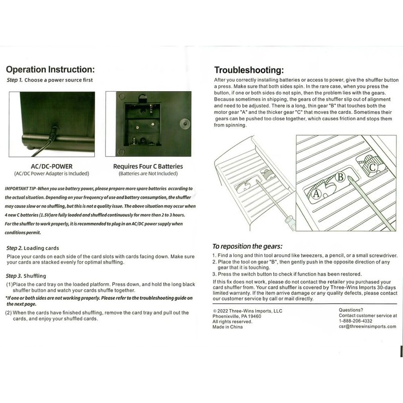 • IMPORTANT TIP - Battery-Operated: The card shuffler may cause slow or no shuffling based on your frequency of use and battery consumption, but it is not a quality issue. Four brand new C batteries (1.5V) have been full load shuffled continuously for more than 1 to 2 hours, and the above situation may occur.