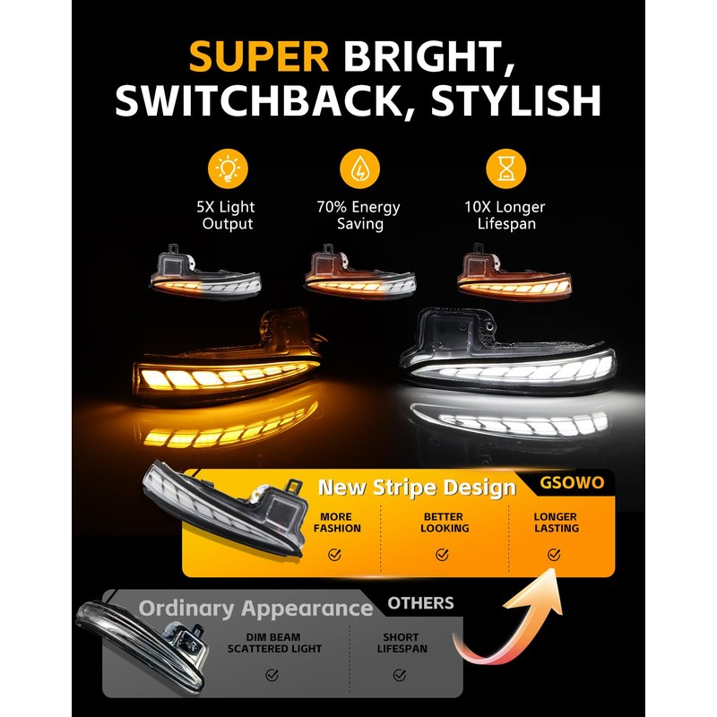 - 🏆[High-Quality Material] GSOWO LED side mirror is made of durable ABS material, making a sealed design and waterproof IP65. High strength and good heat resistance do not fade with long-time exposure.