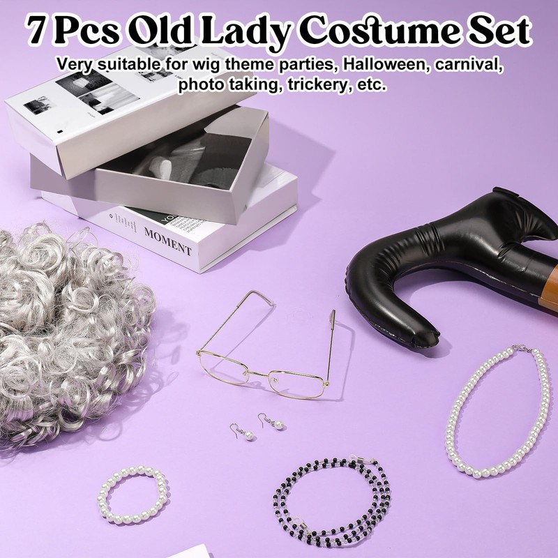 - 【Easy to match】: This outfit provides a great foundation for adding a variety of accessories to enhance the overall look. You can match it with a cane, wig or glasses to complete the transformation into an old lady. The set includes: 1 granny wig, 1 pair of glasses, 1 artificial pearl necklace, 1 pair of earrings, 1 artificial bracelet, 1 glasses chain, 1 inflatable cane, which is enough to meet your dressing needs.