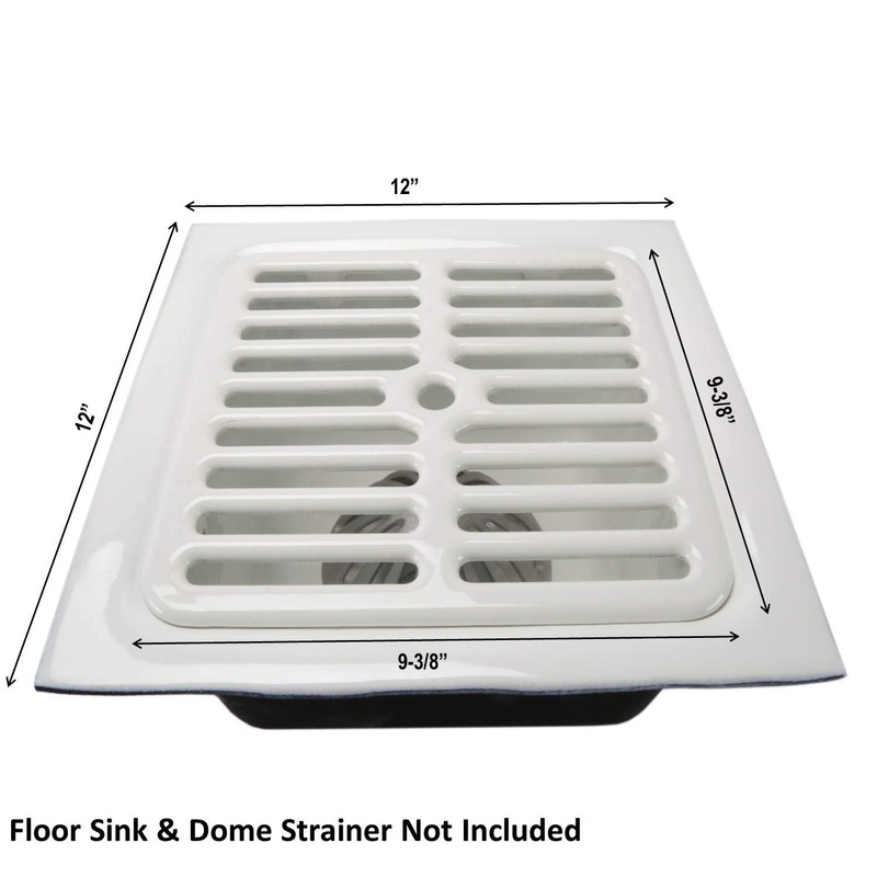 * Built with a combination of cast iron porcelain and ceramic surface for easy cleaning that offers a longer lasting grate. * Floor sink top grate is perfect for any restaurant, bar, buffet, or eatery where water needs to be drained from food or other items. * This floor sink top grate is a perfect fit for 12” x 12” floor sinks. * Floor grate hole openings are large enough to allow proper drainage of water to keep the floor safe and dry for walking conditions. * Top grate - full size: 9-⅜” W x 9-⅜” L x 1-¼ H. **Package includes:**