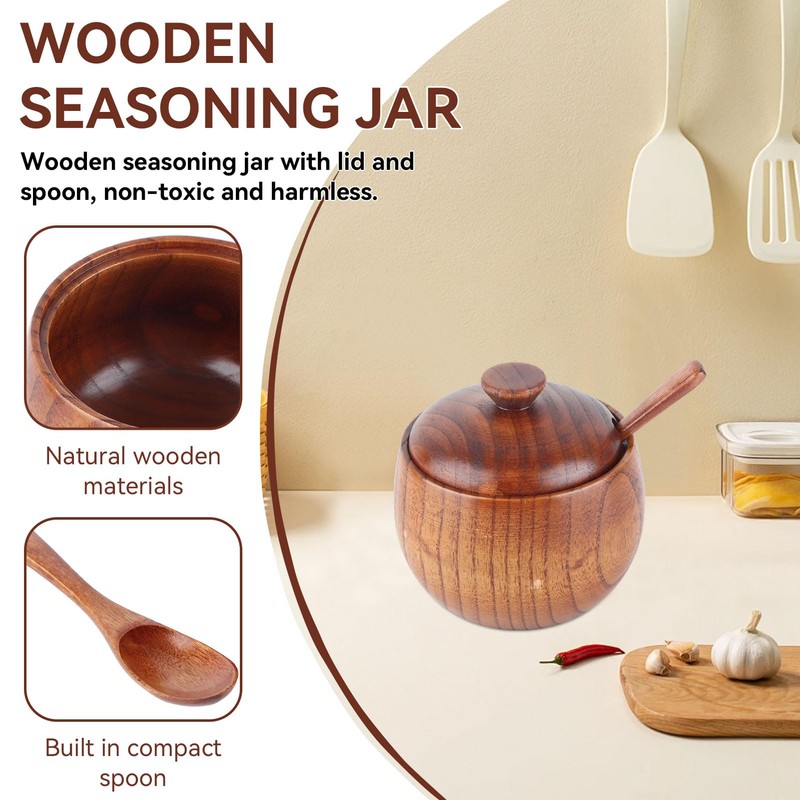 Gsycle 1Pcs Solid Wood Spice Jar, Seasoning Pot Sugar Bowl Wood Salt & Spice Box Salt Keeper with Spoon and Lid for Kitchen Tool
