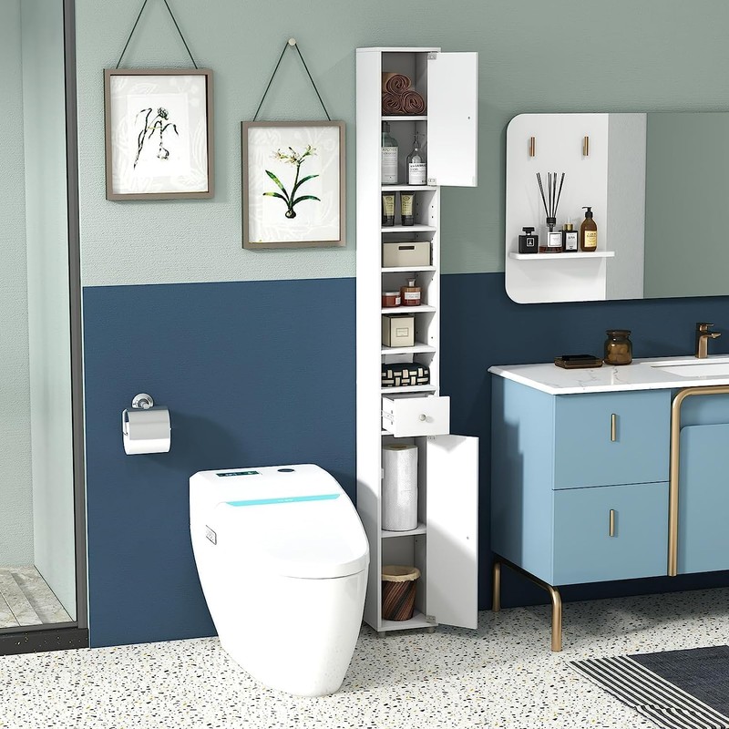 - 【Fit Perfectly in Tight Space】: With 8" x 8" length and width, this 71" tall linen tower makes the most of the vertical space in narrow area. Top and bottom cabinets are perfect for storing towels, taller shampoo bottles and detergents. The middle open shelves and the drawer help store small items such as toothpaste and toothbrushes.