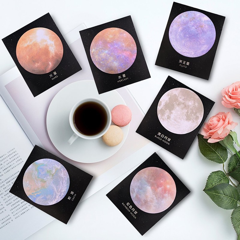 - 6 planet sticky notes: Earth, Black Moon, Rainbow Moon, Mars, Pluto, Mercury. Size:75mm/2.95in(Dia); 30 sheets/Pad