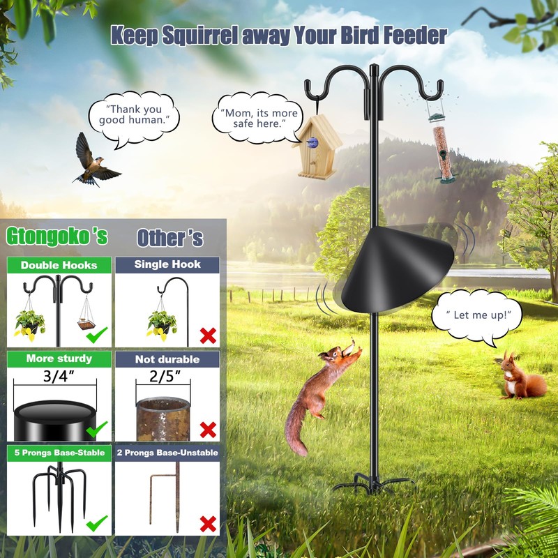 Gtongoko Bird Feeder Pole Squirrel Proof, 108 Inch Double Shepherds Hook for Outdoor with Squirrel Baffles Adjustable Heavy Duty with 5 Prongs Base for Hanging Plants, Bird Feeders, Black