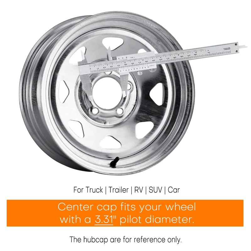 - Fitment: These center wheel caps fit a 3.31" center bore. Our push through chrome center cap fits your truck trailer or RV SUV wheel with a 3.62" pilot diameter. Other sizes of hubcaps can be found in our store. (steel.frame.motor).