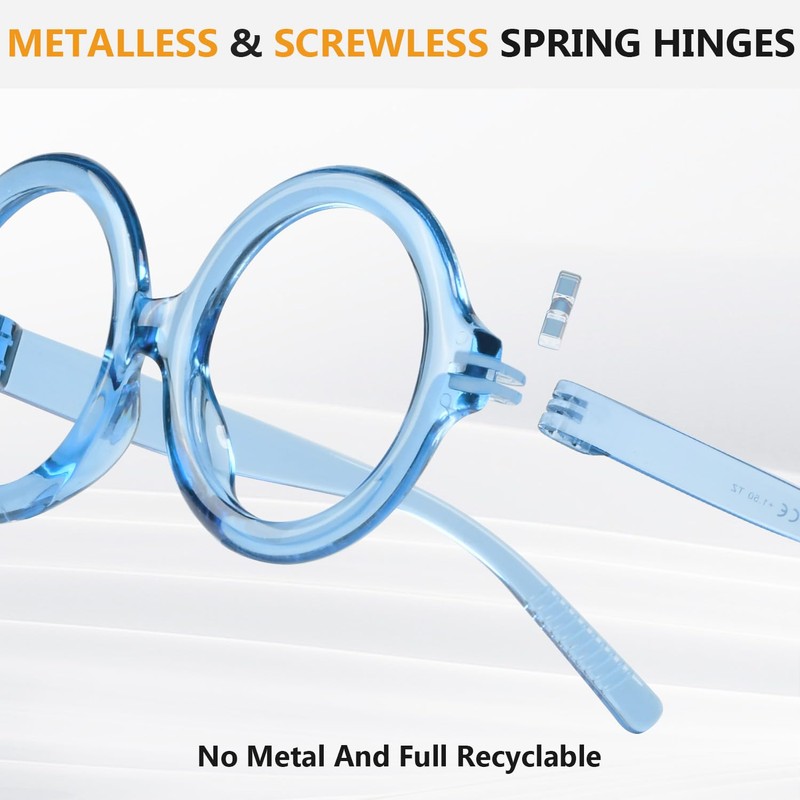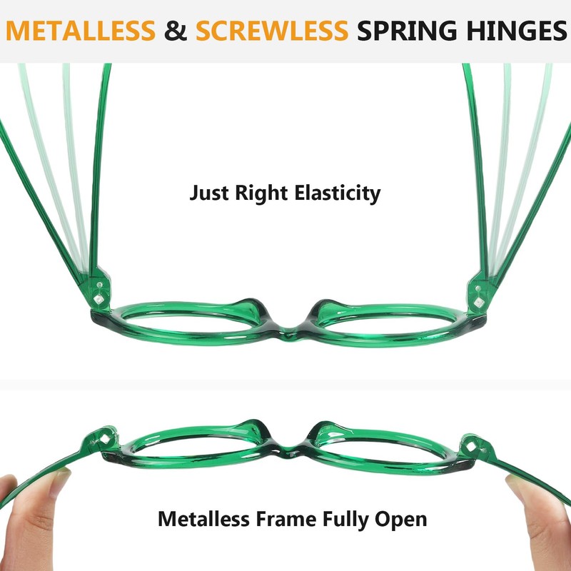 • The large round cheaters glasses are durable and less breakable. Metalless screwless spring hinges contain no screws, avoiding the problems of screws falling out and hinges damaged, making these reading glasses last significantly longer.