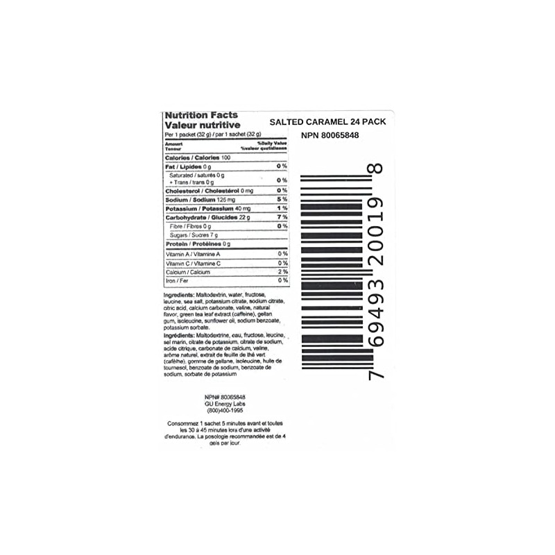 GU Original Sports Nutrition Energy Gel is the energy gel that started it all. In 1993, Dr. Bill Vaughn developed the worlds first energy gel to help his daughter perform better during ultra-marathons, and GU has been helping to propel the worlds most successful extreme athletes to success ever since. GU Energy Gel sustains all forms of athletic activity with a highly compact, portable, and calorie-dense packet that is loaded with carbohydrates that can be rapidly absorbed. Branched-chain amino acids limit muscle fiber damage and increase speed of recovery, and extra electrolytes help maintain water balance. Some flavors feature caffeine to increase concentration. While the original formula has been tweaked and evolved over the years, the end result is still the same: GU Energy Gels fuel the best endurance athletes in the world. GU Original Energy Gel comes in a wide variety of good tasting flavors. Each packet contains 450mg of Amino acids, 100 calories, and at least 21g total carbs.