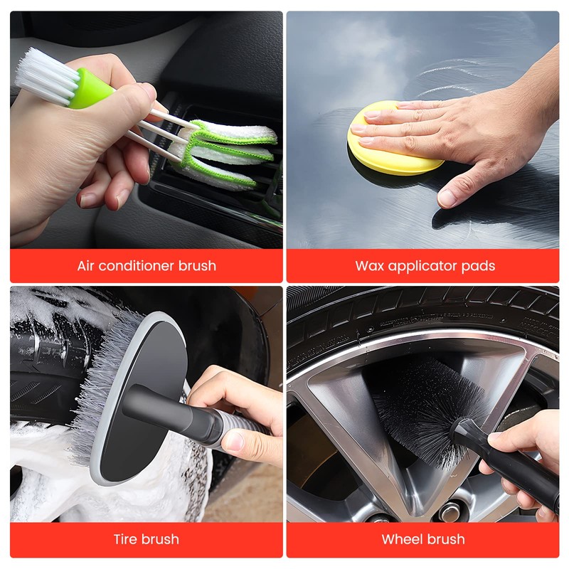 - [Weit verbreitet] - Ein Autoreinigungsset ist bei einer Vielzahl von Menschen beliebt, aber besonders wichtig für Autoliebhaber und Detailer. Verwenden Sie es sowohl für die Innen- als auch für die Außenreinigung von Autos, einschließlich von Motorräumen und Rädern bis hin zu Ledersitzen und Lüftungsschlitzen. Das Set beinhaltet Ihren Reinigungsbedarf, wie Felgen, Auspuffendrohre, Embleme, Speichen, Grills, Stoßstangen und Fahrwerk.