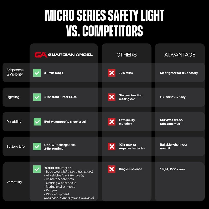 - MAKE IT HOME SAFE – The Guardian Angel Elite Micro provides the same 360 degrees of lighting, in a package half the size of the original Elite Series. With strobe or constant on functions activated independently from the front and rear lights, you can maintain constant visibility in front, while using the back strobes to notify passersby.
