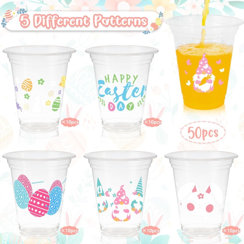 The package includes 50pcs disposable plastic clear Easter party cups, boasting 5 styles of 10 cups each. Designed with adorable and charming Easter patterns, these disposable clear cups are a must-have for any spring gathering party supplies.
