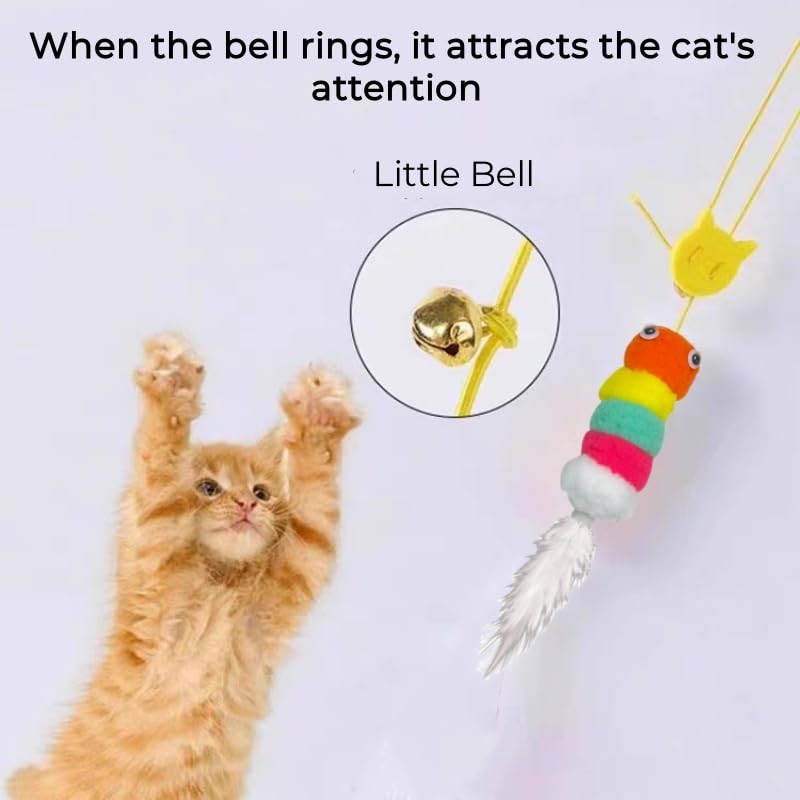- Hanging Door Cat Toy: These indoor interactive cat toys can be hung on door frames, doors,glass window and so on, can be hung anywhere using stickers or Triangle Hook, whenever your cat touches the hanging kitty toys, the feather cat toys wand will move in a shaking way, the bells on the string will make a clanging sound to attract the cat's attention more, it allows the cat to get exercise and prevent obesity and boredom.