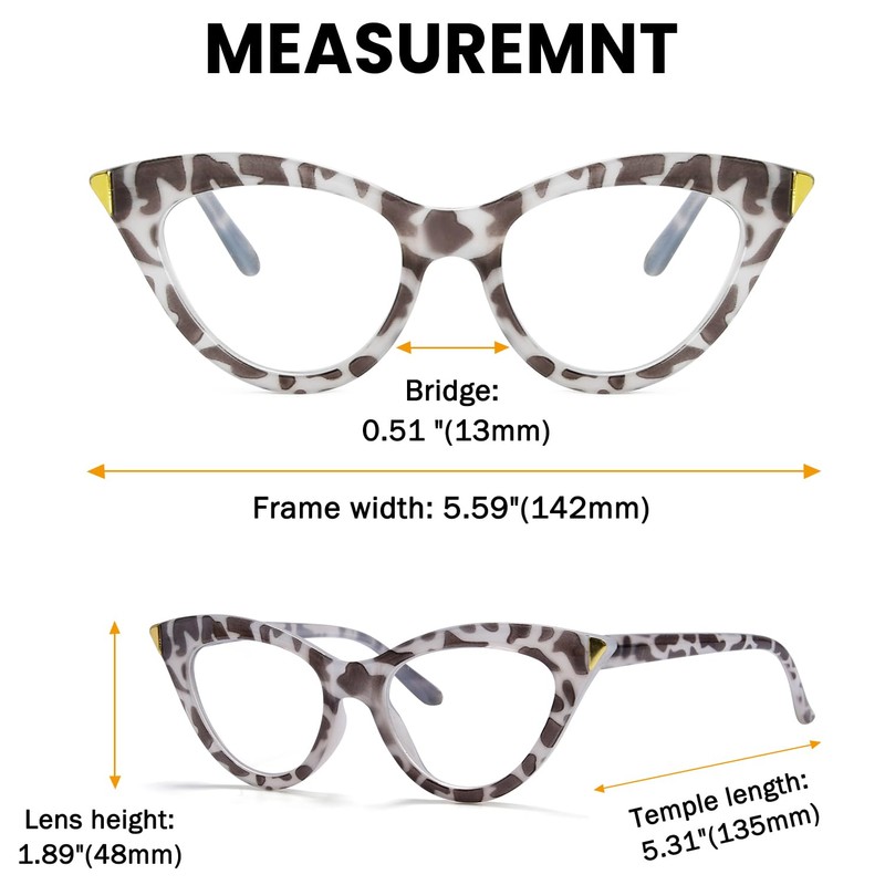• Reading Glasses Dimension - Frame Material is Plastic,Lens width about 1 7/8 inches(48mm),Frame width about 5 5/8 inches(142mm),Lens height about 1 1/2 inches(37.5mm),Frame height about 1 7/8 inches(48mm), Bridge(DBL) about 1/2 inches(13mm), Temple length about 5 5/16 inches(135mm),with spring hinge.
