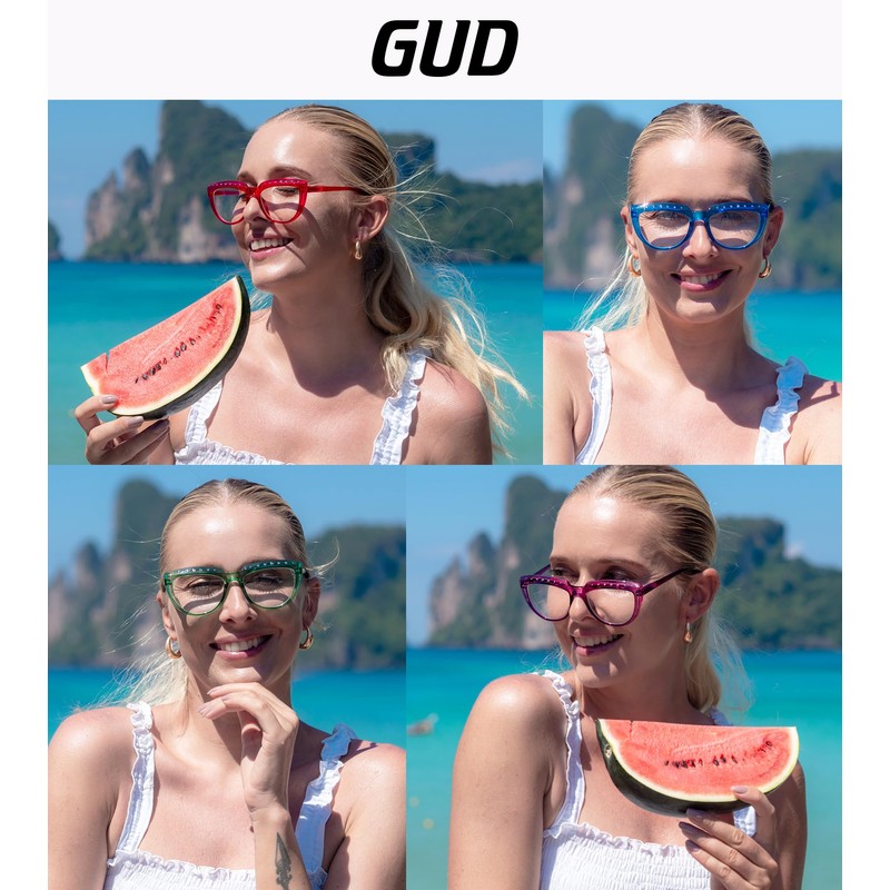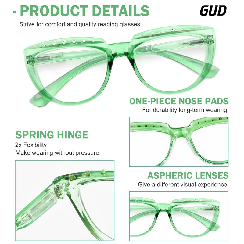 - GUD Reading Glasses - 12 Packs reading glasses for women. Includes 4 colors : pink, blue, green, purple. Spring hinge: YES, Lenses: Aspheric, Head size: Narrow to Medium.