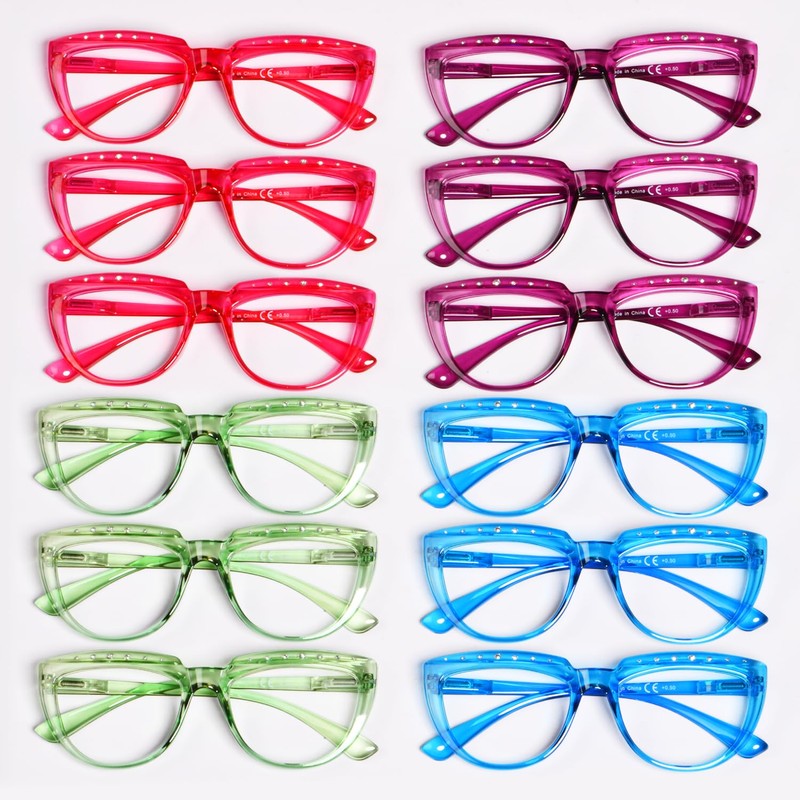 GUD 12-Pack Reading Glasses, Half Moon Design Readers For Women, Spring Hinges & Rhinestone Design +2.75