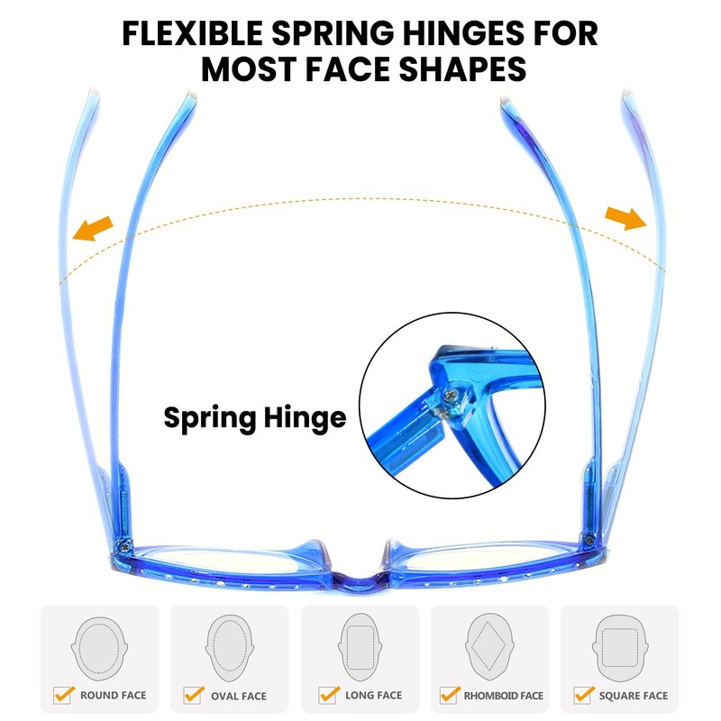 COMFORTABLE TO WEAR: The frame with spring hinges and flexible temple is comfortable for you to wear. Moreover, the magnifying glasses provide clear vision, they really work well when you can't read those fine prints.STYLISH DESIGN: These colorful pattern print readers eyeglasses look good on face while working or reading.Spring hinge : YES, Lenses: Aspheric, Head size: Narrow to Medium.WHENEVER AND WHEREVER YOU NEED: You can place these readers in every place you are used to reading such as your office/ study/bedroom/car.
