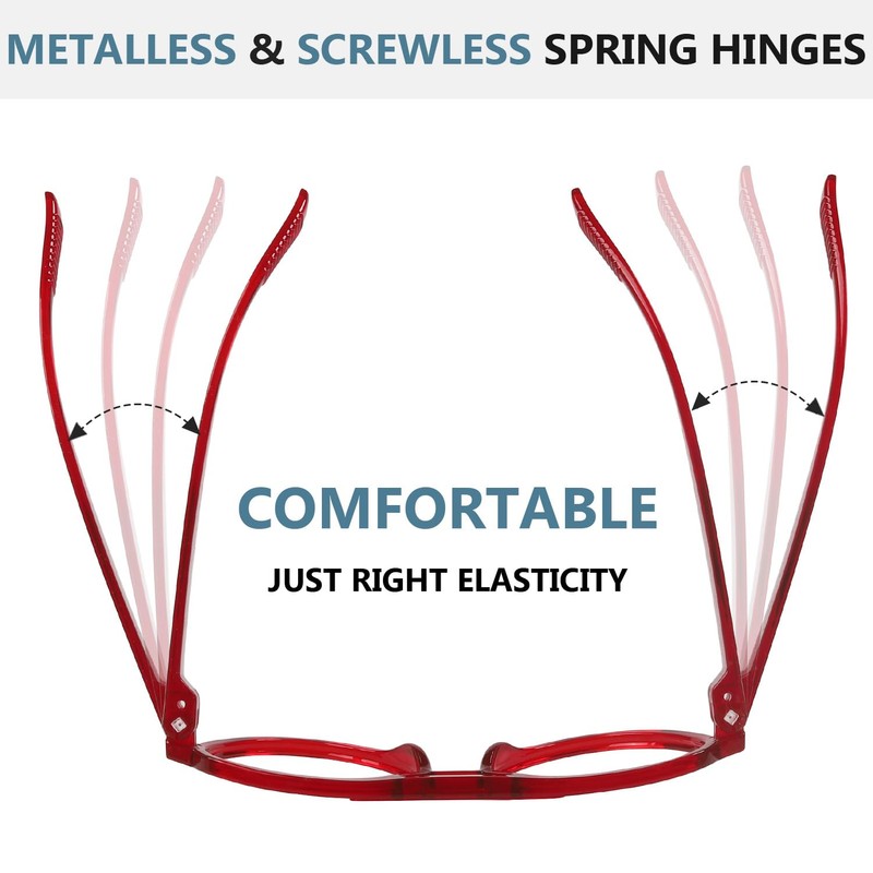 • 🌟 METALLESS & SCREWLESS SPRING HINGES reading glasses do not require screws, which supported by the authorized patent. Unique spring hinges without metal innerspring.