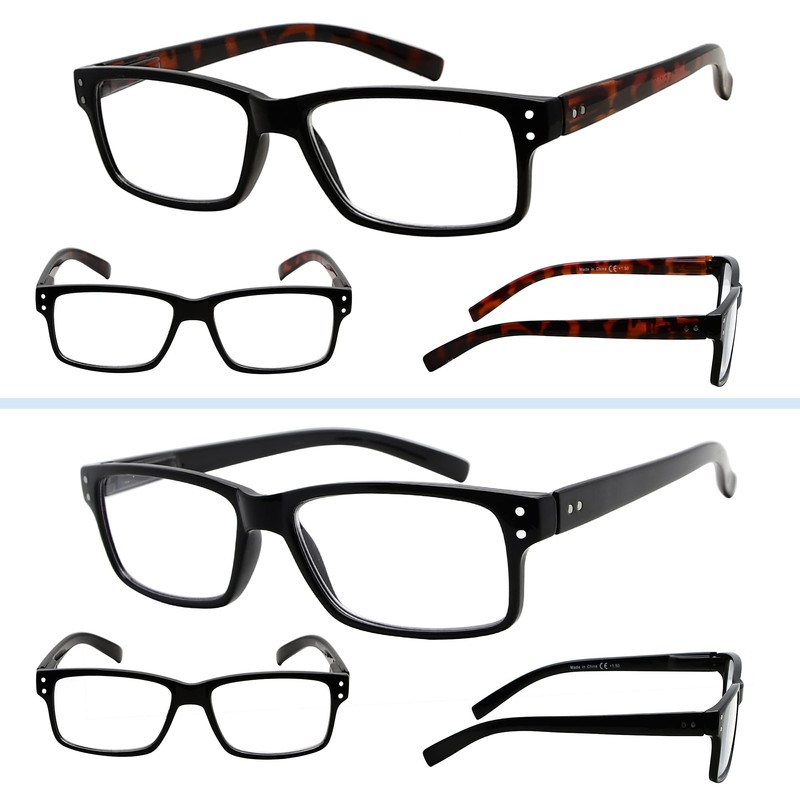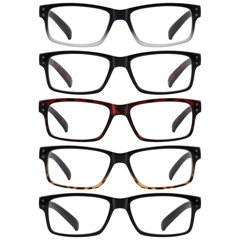 - 5 pairs of men and women reading glasses with colors available: tortoise,black frame with tortoise arms,transparent frame,grey lens,black,black-clear and black-yellow