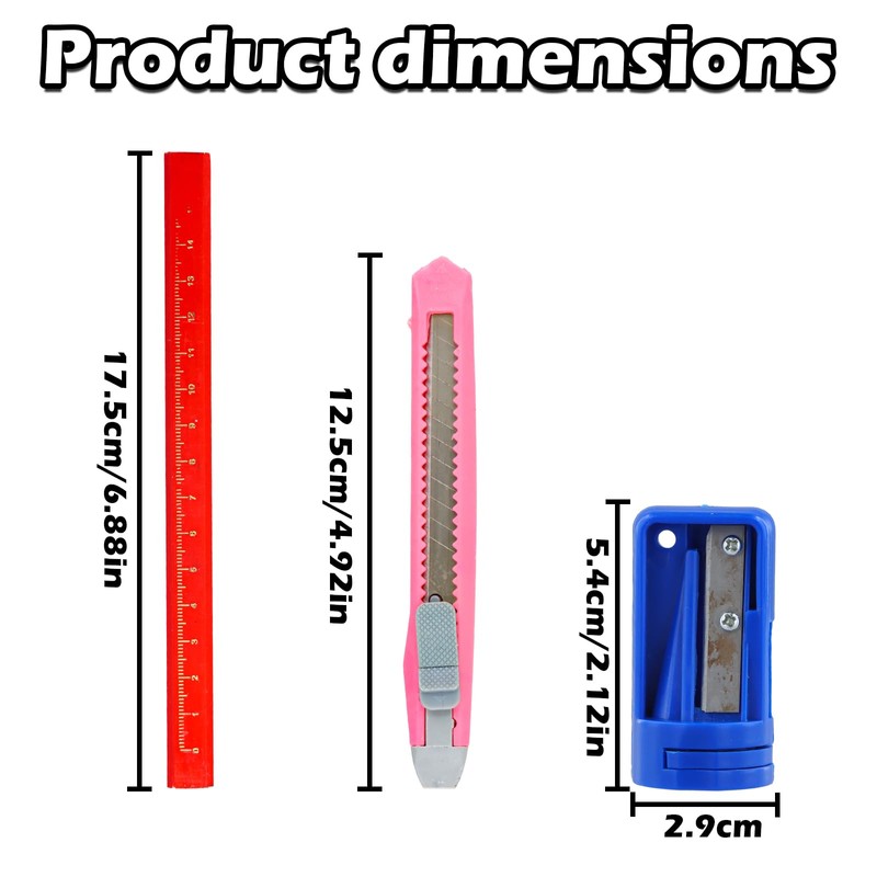 Size: pencil length: 17.5 x 1.5 cm, pencil sharpener: 5.4 x 2.9 cm, engraving knife: 12.7 cm