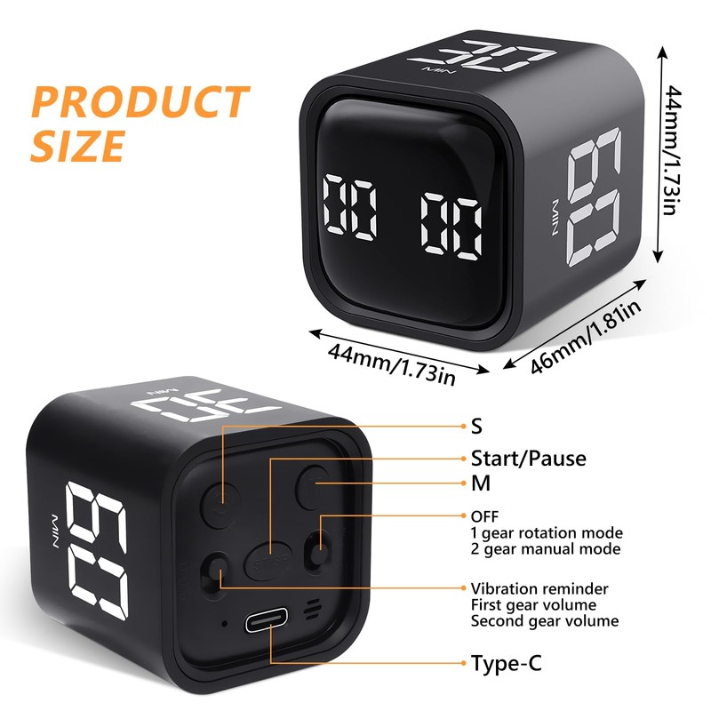 - Compact and Portable: With a size of 1.81*1.73*1.73in, this timer has a simple and modern appearance and is easy to carry. The clear visual screen allows you to see the remaining time. This USB C rechargeable timer can be used for 6-8 months after fully charged, low consumption and convenient.